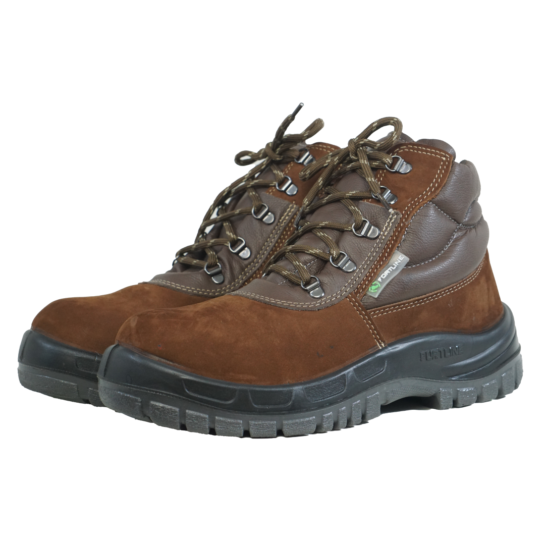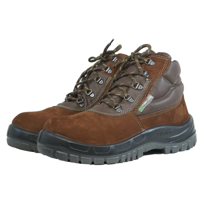 Calçado ocupacional tipo botina, fechamento em cadarço, cano acolchoado, confeccionado em couro nobuck chocolate, colarinho em material couro café, forro da gáspea em não tecido, forro lateral em tecido, palmilha de montagem em não tecido fixada pelo sistema strobel, palmilha interna removível, biqueira de polipropileno para conformação, solado de poliuretano bidensidade injetado diretamente no cabedal.