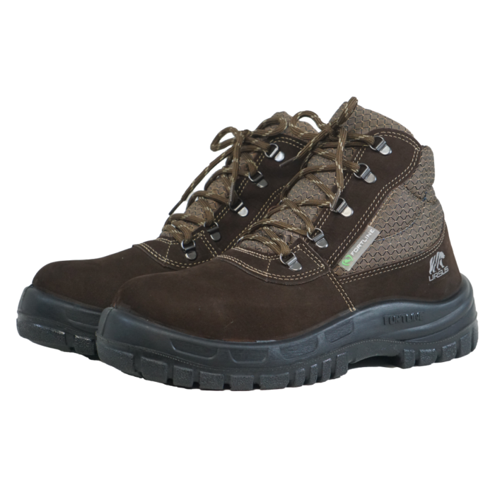 Calçado ocupacional tipo botina, fechamento em cadarço, cano acolchoado, confeccionado em couro nobuck café, colarinho em material têxtil caramelo, forro da gáspea em não tecido, forro lateral em tecido, palmilha de montagem em não tecido fixada pelo sistema strobel, palmilha interna removível, biqueira de polipropileno para conformação, solado de poliuretano bidensidade injetado diretamente no cabedal.