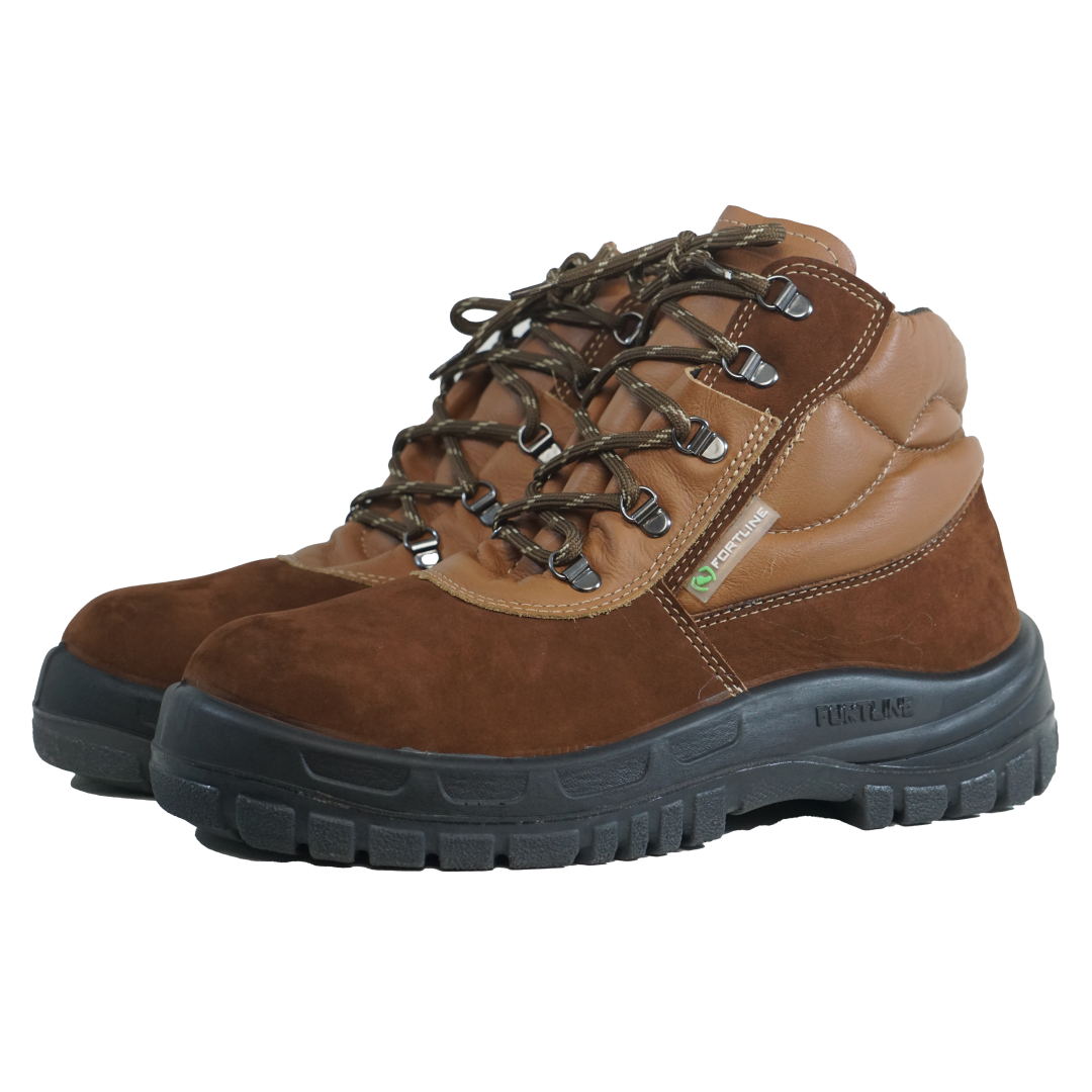 Calçado ocupacional tipo botina, fechamento em cadarço, cano acolchoado, confeccionado em couro nobuck chocolate, colarinho em material couro castor, forro da gáspea em não tecido, forro lateral em tecido, palmilha de montagem em não tecido fixada pelo sistema strobel, palmilha interna removível, biqueira de polipropileno para conformação, solado de poliuretano bidensidade injetado diretamente no cabedal.
