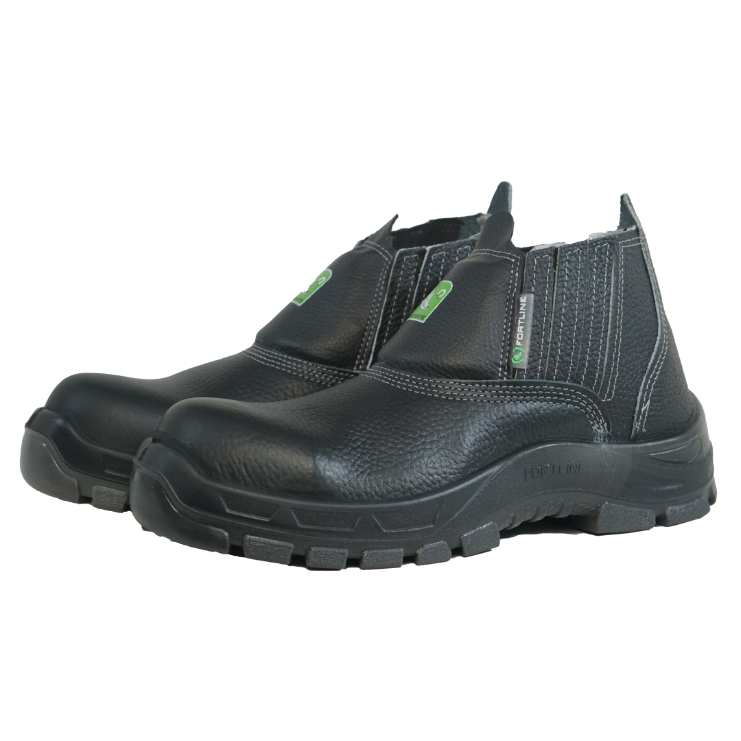 Calçado de segurança tipo botina, fechamento em elástico nas laterais, confeccionado em couro curtido ao cromo, palmilha de montagem em fibras não metálicas fixada pelo sistema strobel, forro interno em não tecido, biqueira de composite, solado de poliuretano bidensidade injetado diretamente no cabedal.
