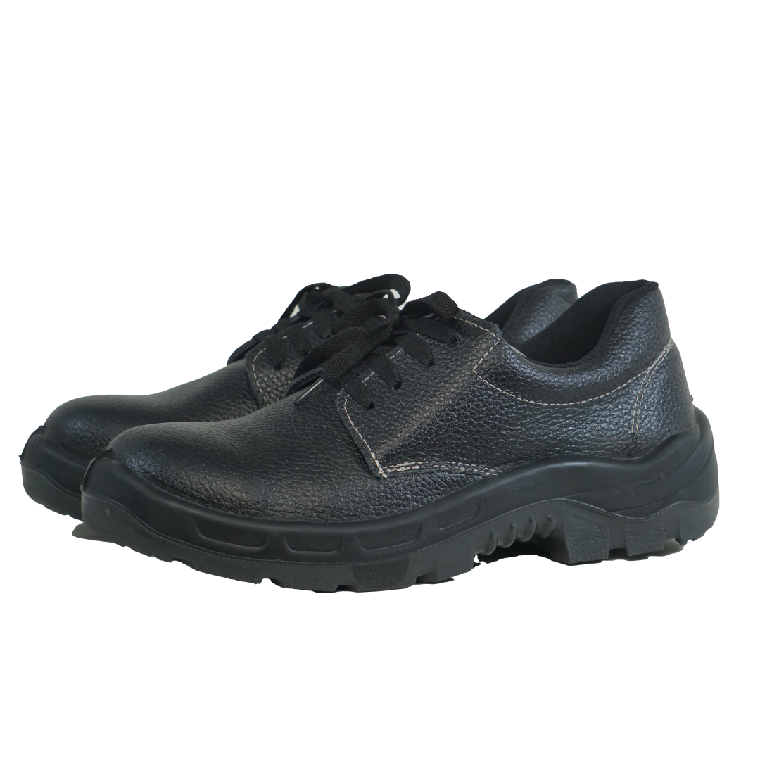 Calçado ocupacional de uso profissional tipo sapato, fechamento em cadarço, confeccionado em couro, forro da gáspea em não tecido, forro lateral em tecido, palmilha de montagem em não tecido fixada pelo sistema strobel, palmilha interna removível, biqueira plástica para conformação, solado de poliuretano bidensidade injetado direto no cabedal, resistente ao escorregamento e ao óleo combustível.