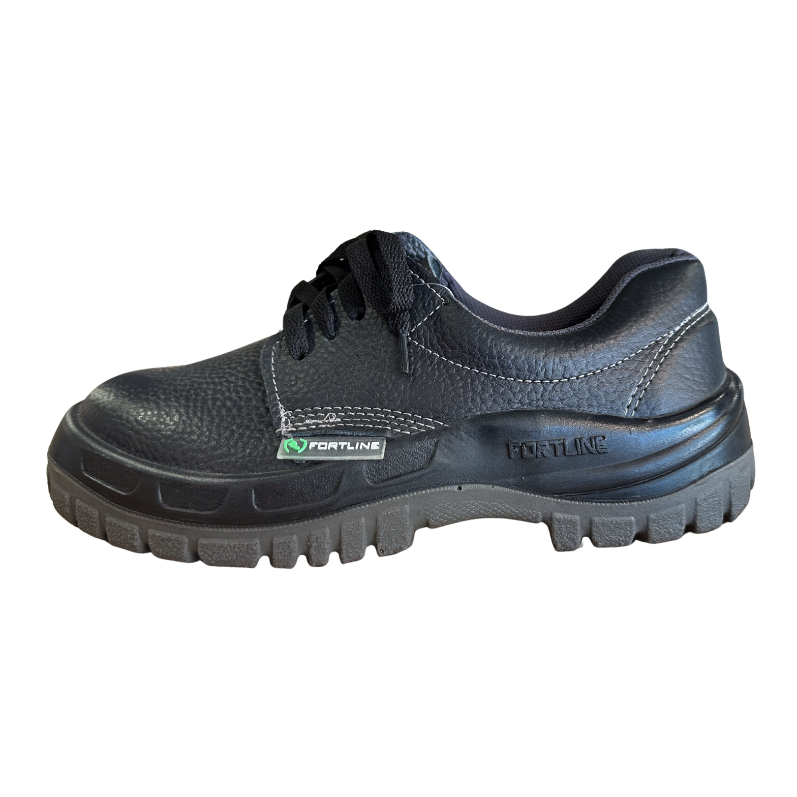 Calçado de segurança de uso profissional tipo sapato, fechamento em cadarço, confeccionado em couro vaqueta, forro da gáspea em não tecido, forro lateral em tecido, palmilha de montagem em não tecido fixada pelo sistema strobel, palmilha interna removível, biqueira de aço, solado de poliuretano bidensidade injetado direto no cabedal, resistente ao escorregamento e ao óleo combustível.